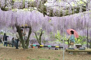 広大な敷地に広がる色とりどりのフジの花